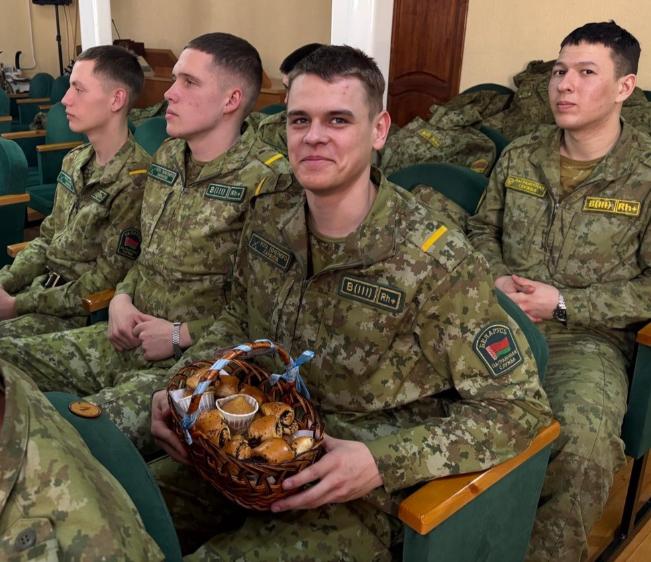 В гости к защитникам приехали те, кто лучше всех знает, что такое тепло и забота — представительницы Белорусского союза женщин Заводского района г. Минска. Под музыку в зал вышли девушки с корзинами румяных пирогов. Этот дар стал настоящим символом дома. «Мы знаем, как вы скучаете по родным, — обратилась к военнослужащим Жанна Севостьяновна Лазарчик, директор ГУО «СШ№144». — Этот пирог испечён с той самой любовью, с какой ваши мамы встречают вас в увольнении. Пусть он напомнит вам о самом главном — о семье и Родине». В эти минуты в воздухе будто запахло детством. Ребята, принимая угощение, смущённо улыбались, но в глазах каждого читалась благодарность. Ведущие прочли проникновенные строки о материнских руках, которые молятся и ждут своих сыновей через сотни километров. Особую атмосферу создал руководитель военно-патриотического воспитания столичной школы № 144 Артём Иванович Шоломицкий, исполнивший проникновенную песню Олега Газманова «Мама». В зале не осталось равнодушных — знакомые до слёз строки о материнской любви тронули сердца даже самых суровых бойцов.
