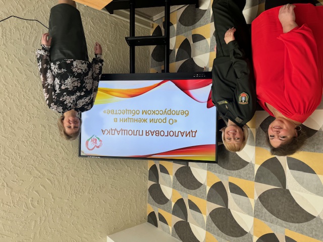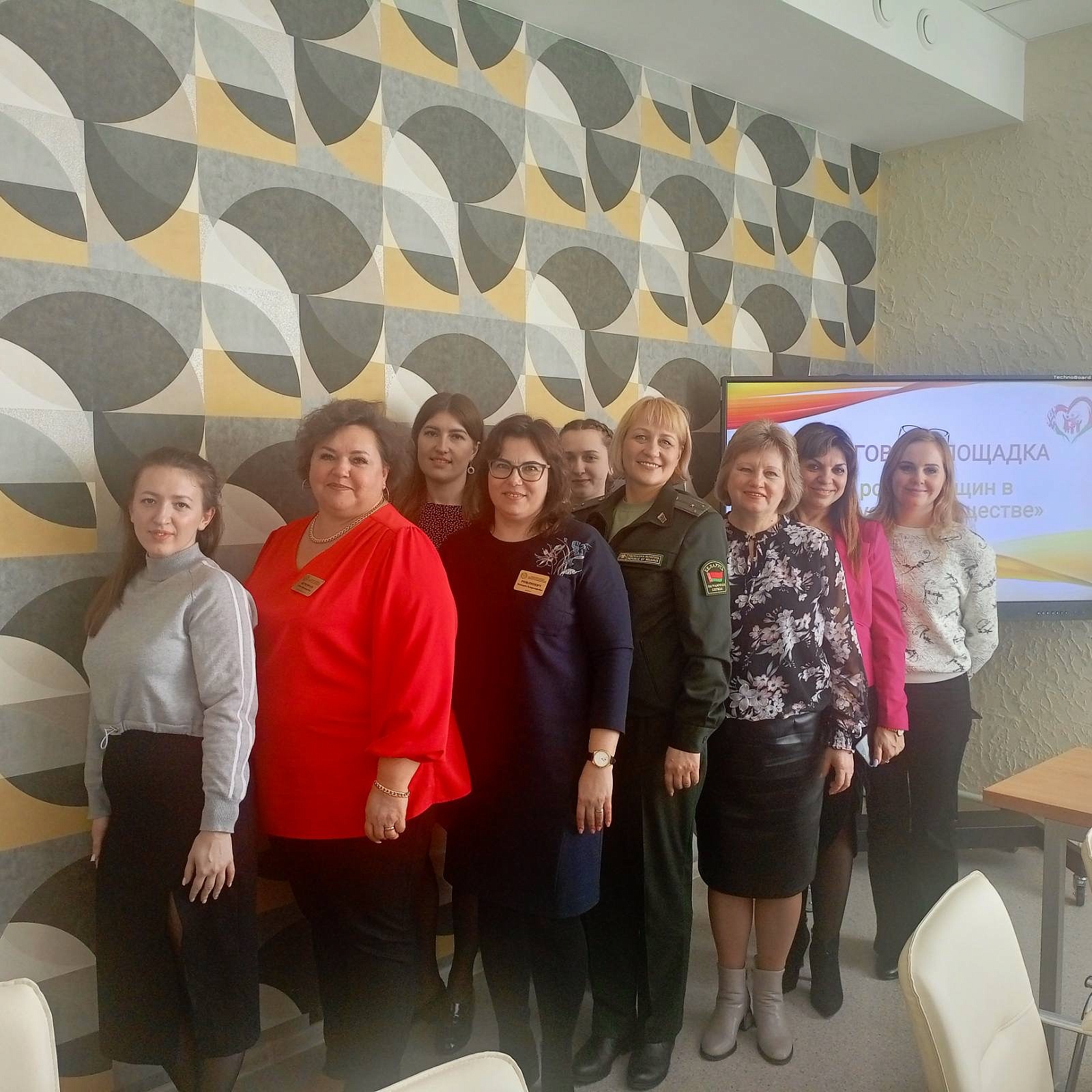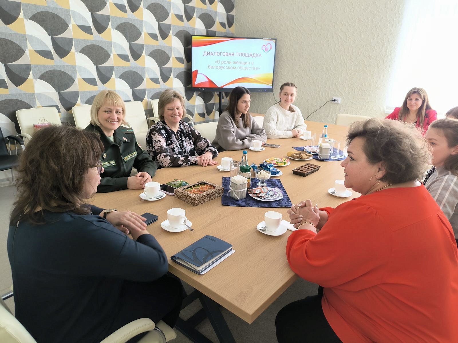 Затем мероприятие продолжилось диалоговой площадкой, посвященной роли женщины в белорусском обществе. Участницами встречи стали директор ТЦСОН Виктория Владимировна Романович, ее заместитель Елена Александровна Вергейчик, заместитель директора Дзержинского районного центра культуры и народного творчества Лидия Иосифовна Драчинская, а также старший офицер отделения информации и пропаганды отдела идеологической работы войсковой части 1463 старший лейтенант Оксана Вениаминовна Смирнова.