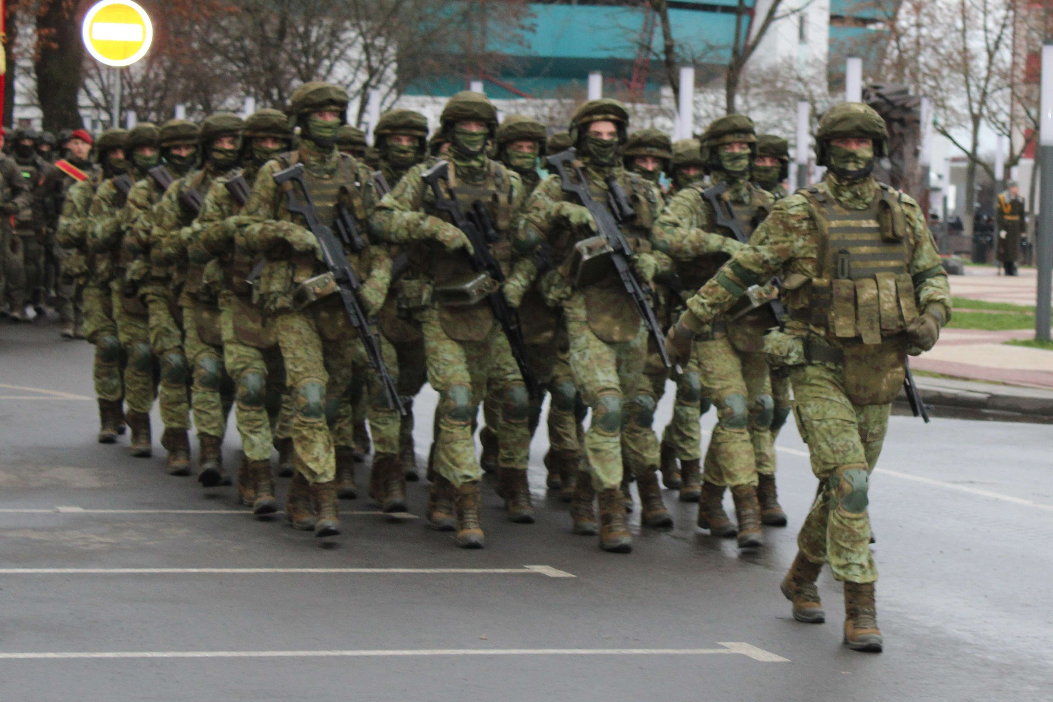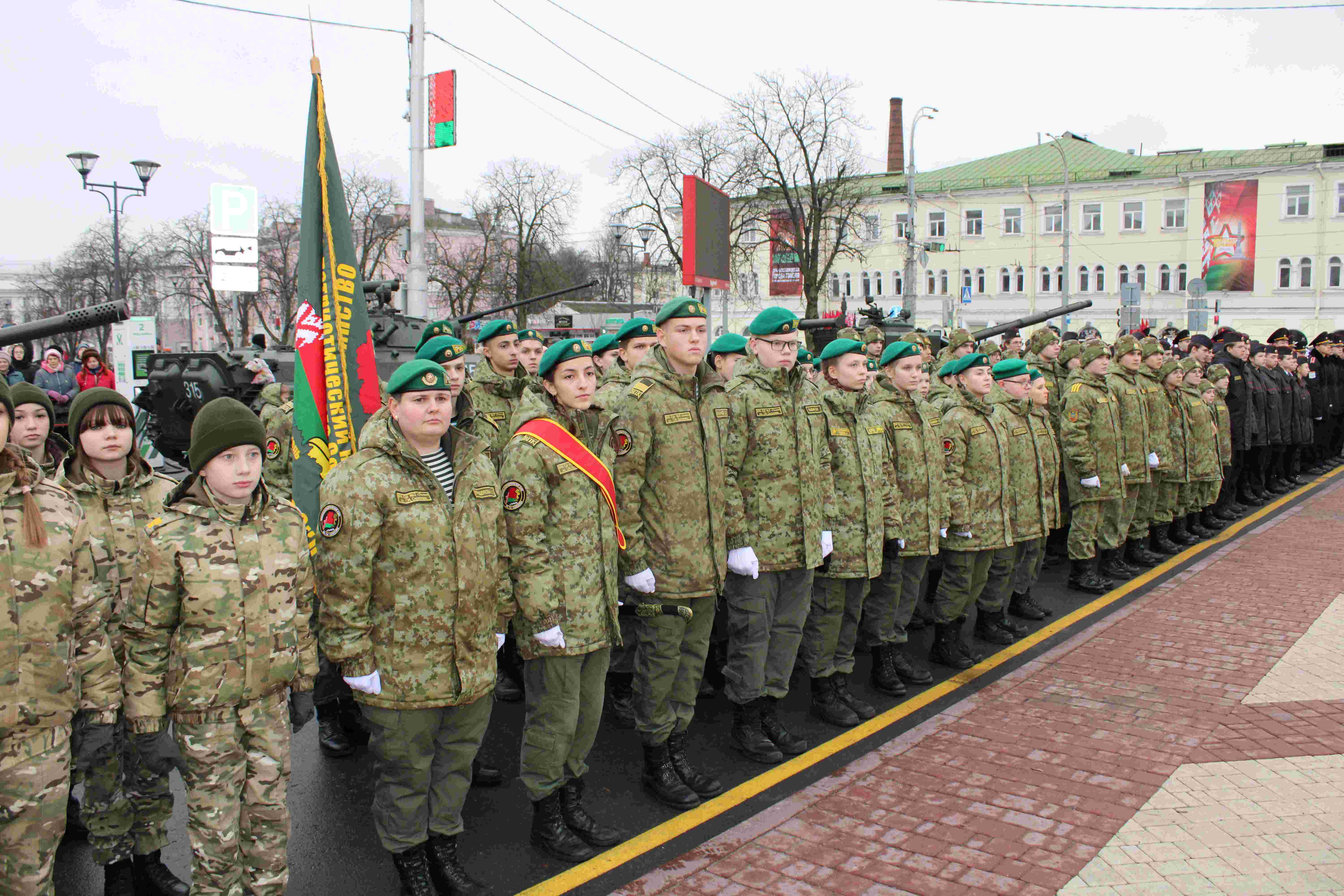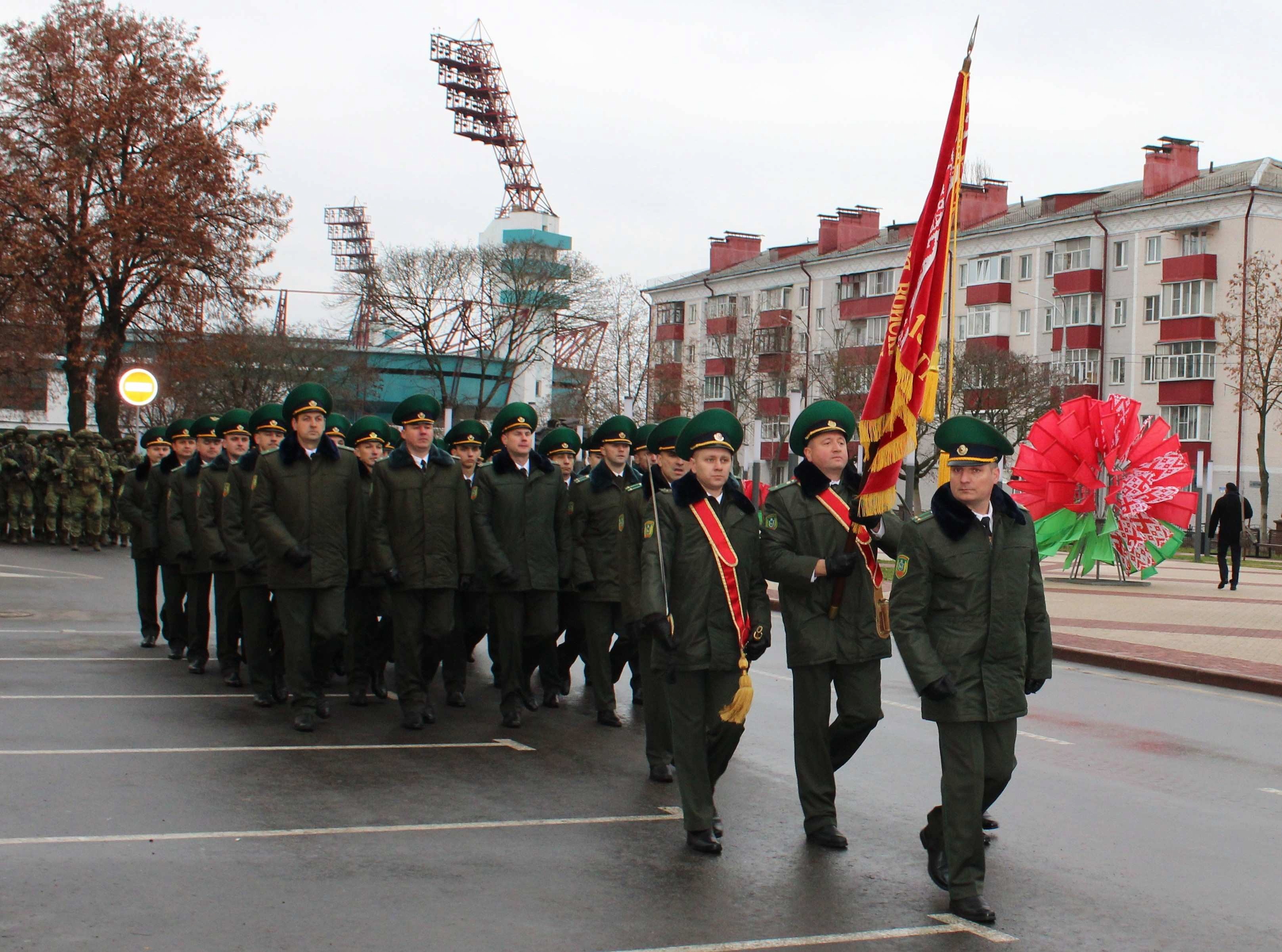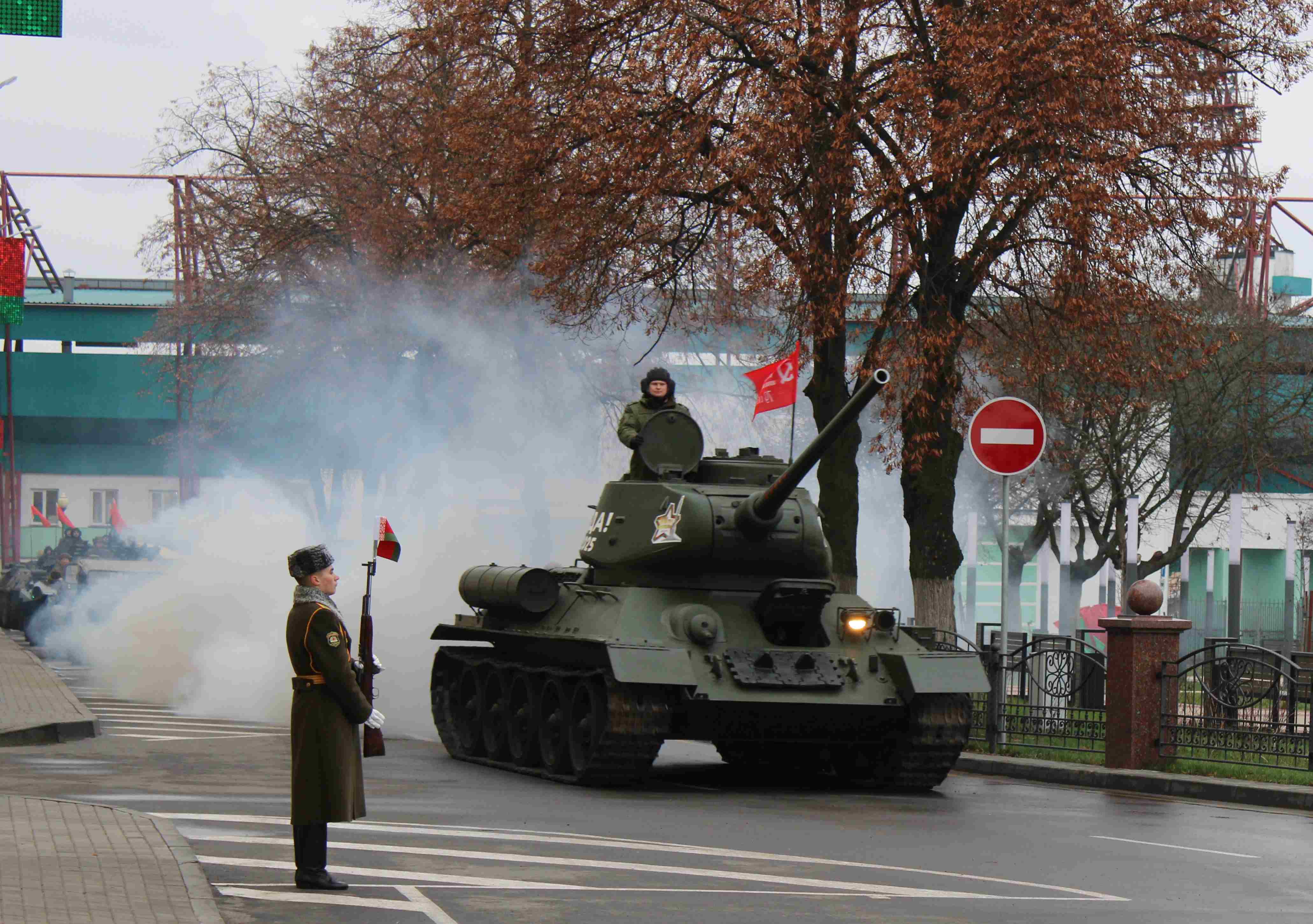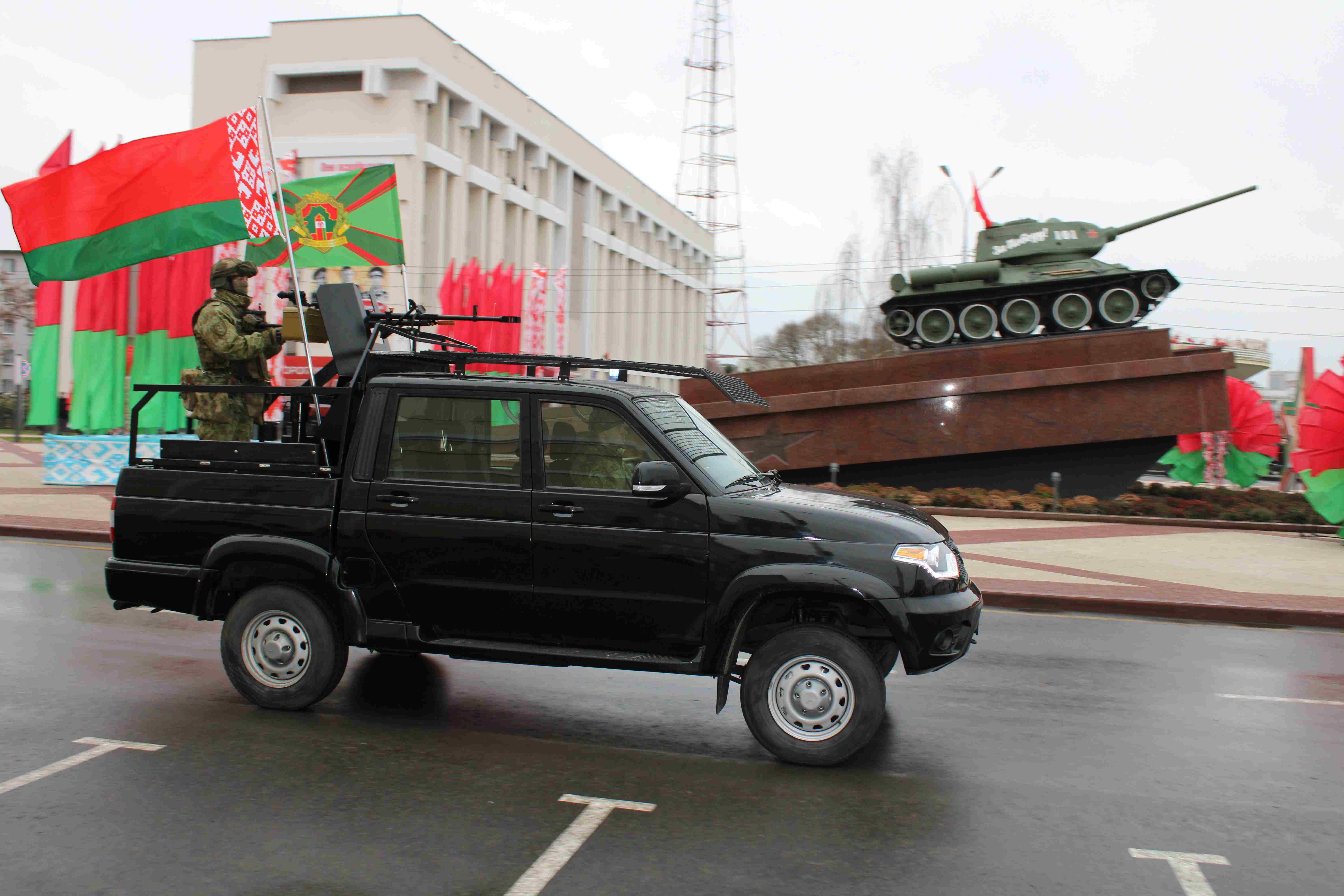 Возглавил парад легендарный танк Т-34. В пеших парадных расчетах по площади Восстания чеканили шаг вместе с представителями других родов войск Гомельского гарнизона офицеры-пограничники, а также военнослужащие маневренной группы Гомельской пограничной группы.