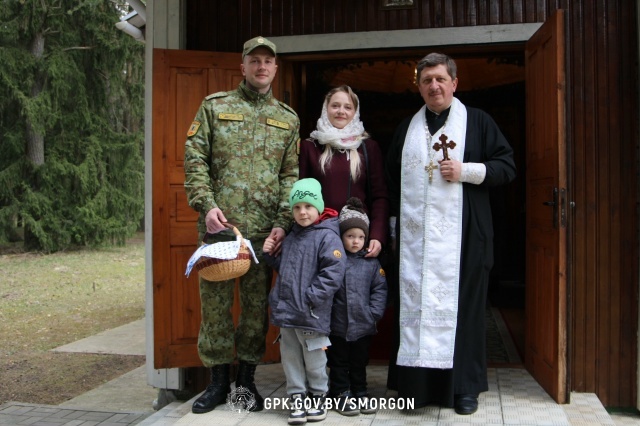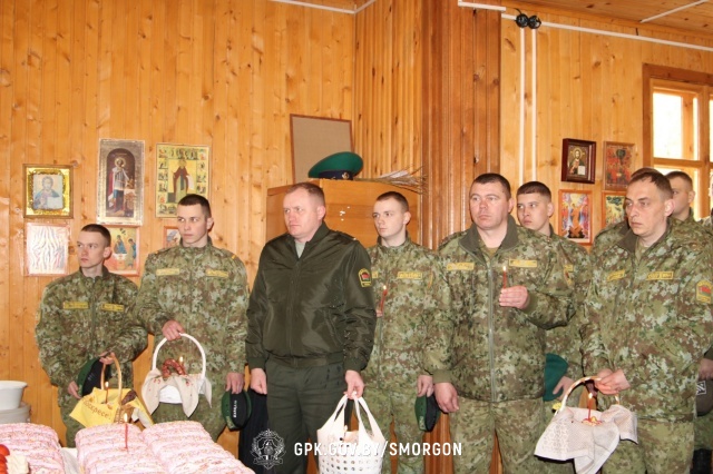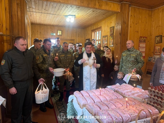 Сегодня, 11 апреля, в преддверии Пасхи в Храме Архистратига Божия Михаила Сморгонской пограничной группы состоялся праздничный молебен, в ходе которого отец Александр поздравил всех со светлым праздником и освятил пасхальную трапезу.